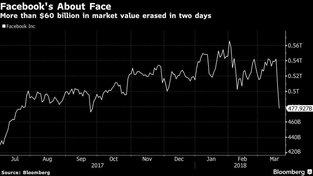 Facebook’s stock price fell as much as 6.2 percent in New York before closing 2.6 percent lower. The stock has slumped more than 9 percent since Friday’s close, giving up about $50 billion in market capitalization. That’s almost as much as the total value of Tesla Inc.