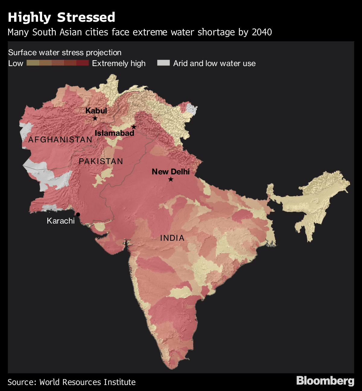 The World Economic Forum rates the water crisis as the biggest risk in Pakistan, with terrorist attacks third on the list. Waseem Akhtar, Karachi’s mayor, told Bloomberg the city needs to fix widespread leakages and theft, but funding is scarce.