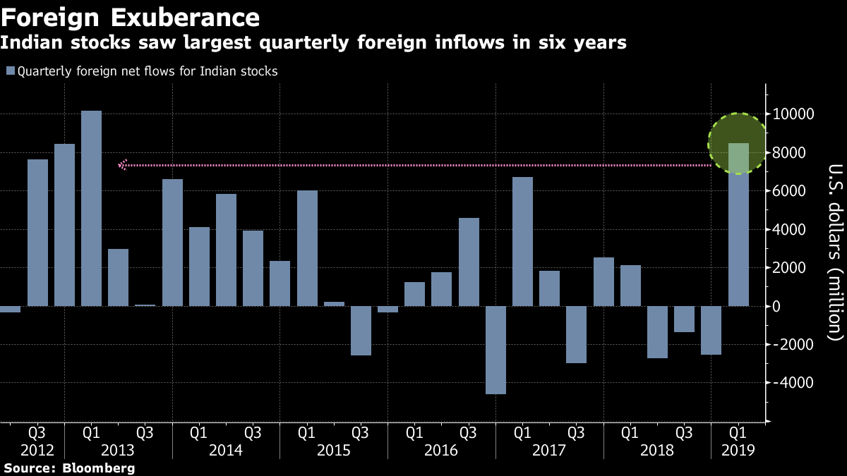 Foreign inflows have seen a resurgence as global funds purchased a net $8.4 billion of Indian shares in the first three months of the year. That puts the country on track for the biggest annual flood of overseas capital since 2014, when Modi first became prime minister and the S&P BSE Sensex Index hit 54 record highs.