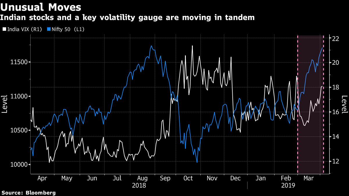 For the past three weeks, both the stock market and a gauge tracking its volatility rose in tandem, a rare occurrence that indicates signs of hedging. The NSE Nifty 50 Index and India VIX Index, which tend to go opposite ways, have moved in the same direction five weeks already this year, on track for the highest proportion since 2014.