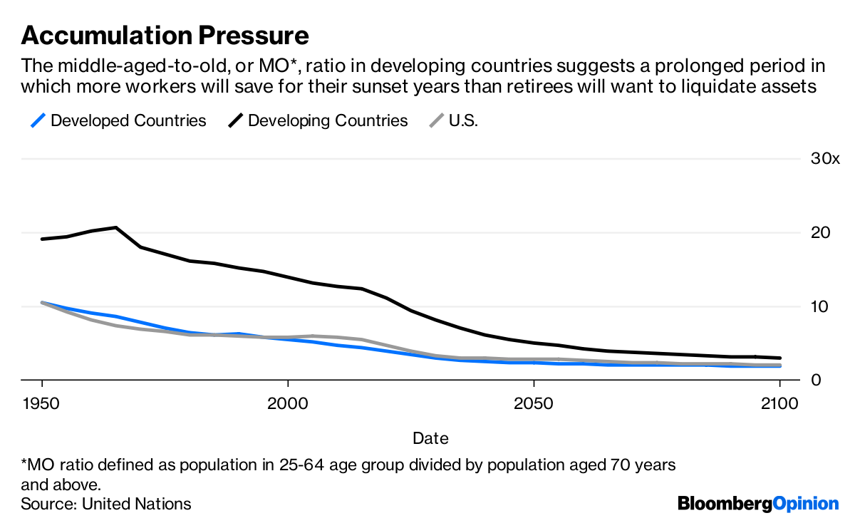 Population pyramids will continue to cast a long shadow on the investment landscape. In developing nations, there still are 12 people in the 25-64 age group for every person aged 70 or more. By 2055, on current United Nations projections, emerging markets will be as old as developed countries are now, with four young and middle-aged workers for every old person.