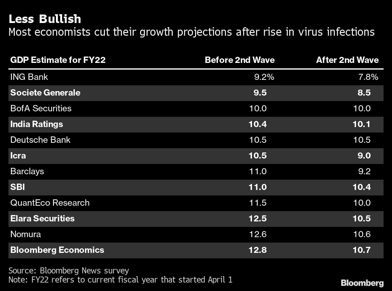The economy is on track to grow 10% in the year that began April 1, according to the median of 12 estimates compiled by Bloomberg News. That’s after several economists downgraded their forecasts in recent weeks to factor in local curbs on activity, including in India’s political and commercial hubs.