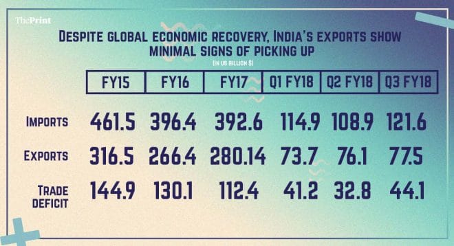 Estimates by research firm Nirmal Bang have pegged exports for 2017-18 at $306 billion, with $227.3 billion already pulled off — an increase from the 2016-17 period, but still short of 2014-15 numbers.