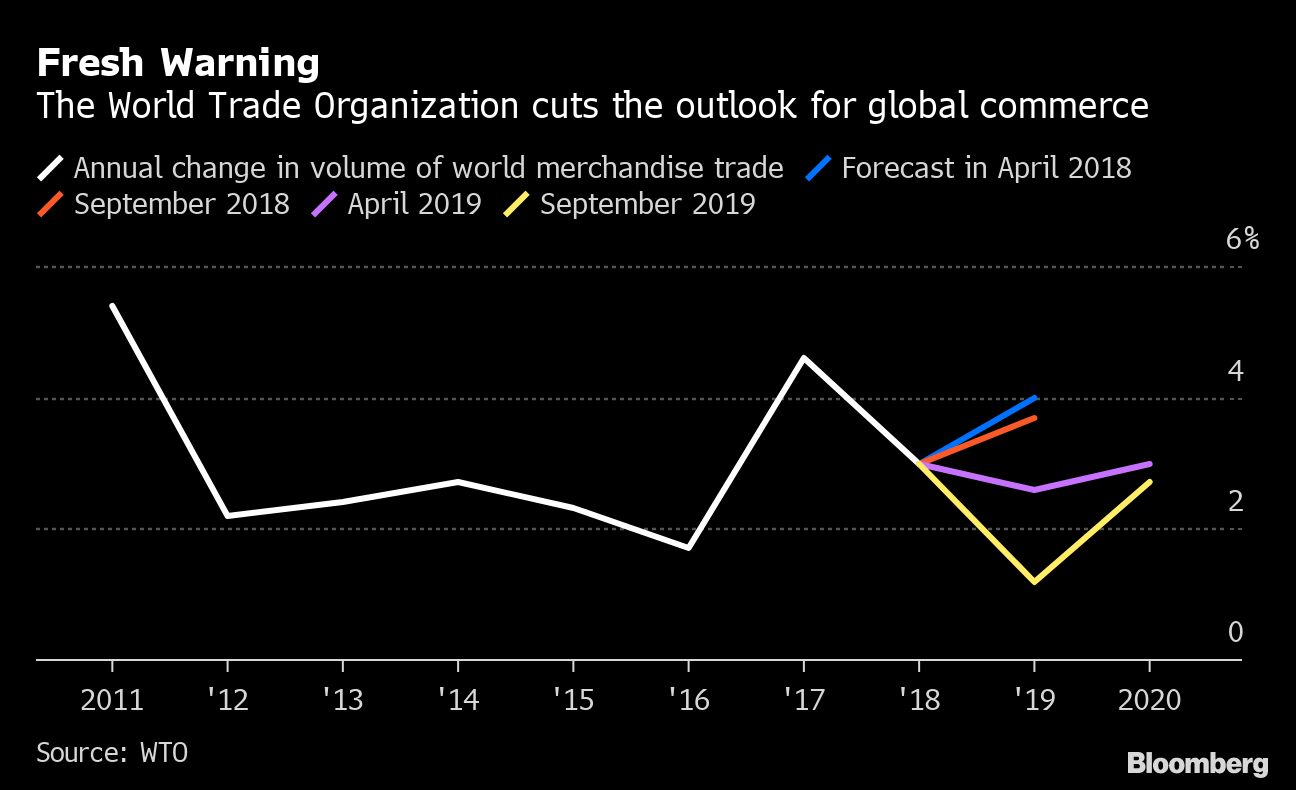 The outlook marks a sharp downgrade from the WTO’s previous projections in April, when the Geneva-based organization predicted a 2.6% gain in global trade in 2019 and 3% the following year. It also underscores the risks facing international commerce as the U.S. threatens more tariffs on Chinese imports and prepares new, WTO-sanctioned levies on goods from the European Union.
