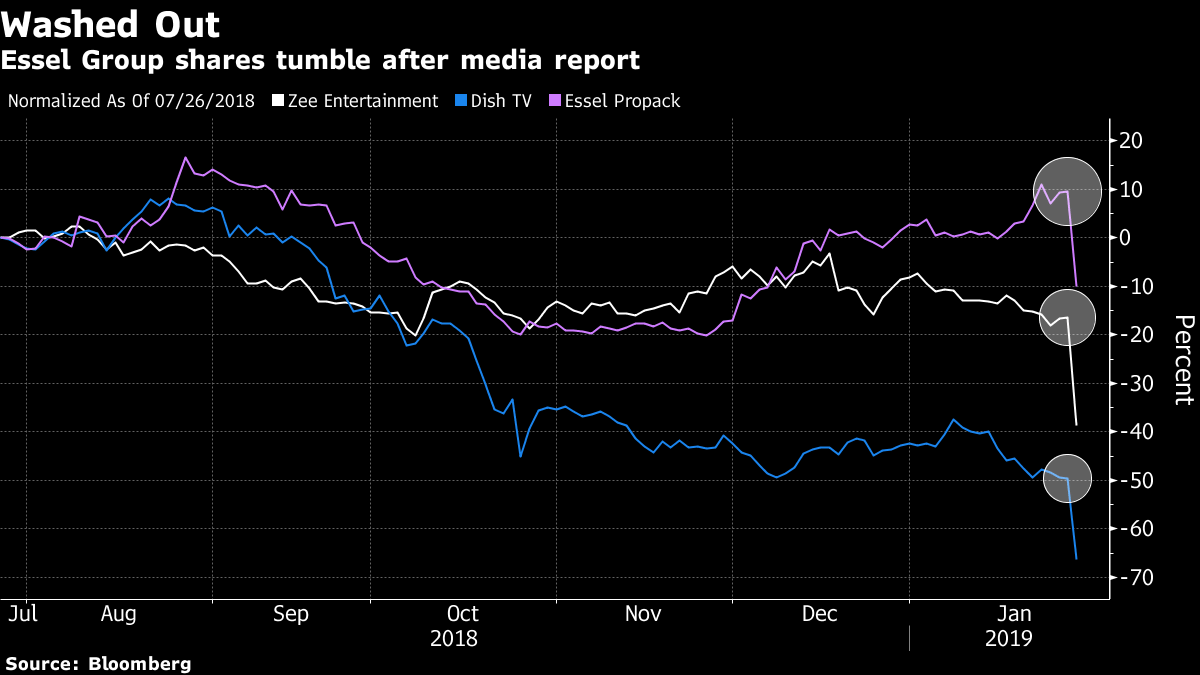 Shares of India’s biggest television network and group company Dish TV India Ltd. plunged more than 25 per cent in the last two hours of trading after news website The Wire published a report alleging that companies linked to Chandra were involved in fraud and money laundering. The group released statements on Friday and Sunday denying the allegation.