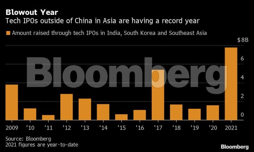 Tech companies from those two countries and Southeast Asia have raised $8 billion from first-time share sales this year, already blowing past the previous annual peak. The tally is poised to get bigger with planned listings by companies including Indian fintech giant Paytm and Indonesian internet conglomerate GoTo, both of which may break local fundraising records.