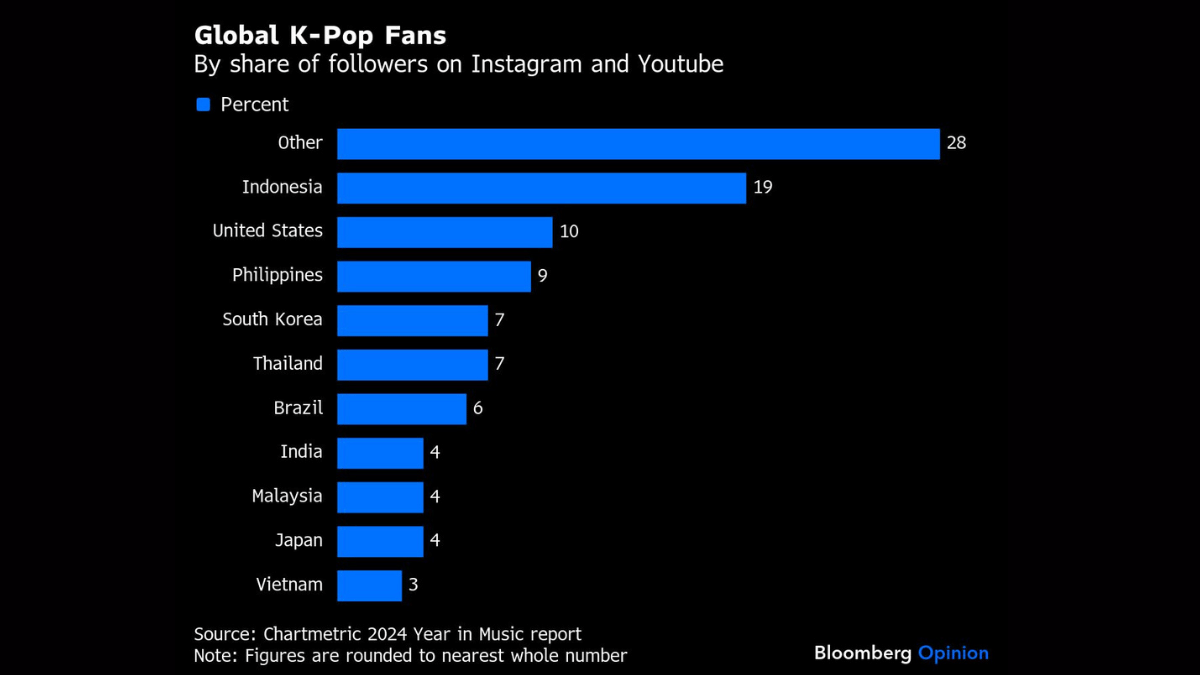 In terms of music consumption, K-Pop is already on that path. Audience data shows that there are now far more fans outside South Korea than at home. According to Chartmetric, the largest group of fans as measured by followers on Instagram and Youtube came from Indonesia, followed by the US and the Philippines. South Korea came in only fourth, just ahead of Thailand and Brazil.
