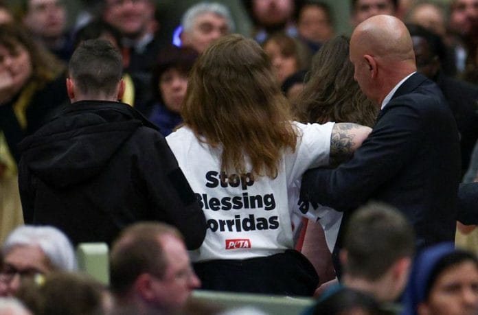 ROME (Reuters) – Two women from an animal rights group interrupted a vespers service presided over by Pope Francis at a Rome basilica on Thursday, shouting and holding up banners against bullfighting before being taken away by guards.