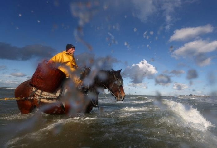 As the bright yellow of Vanbleu’s anorak stands out against the waves, under the water, his draft horse – characterized by its powerful hindquarters – pulls a chain along the sand, causing a vibration that sends shrimp jumping into an outstretched net.