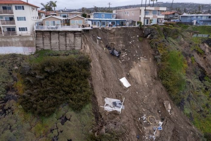 Along the Southern California coast, a swimming pool teeters on the edge of an eroded cliff, and several patios have fallen down to the sea, leaving luxury homes on the verge of collapse. Whole cliffsides are covered in tarps and hillside stairways to the beach have been compromised.
