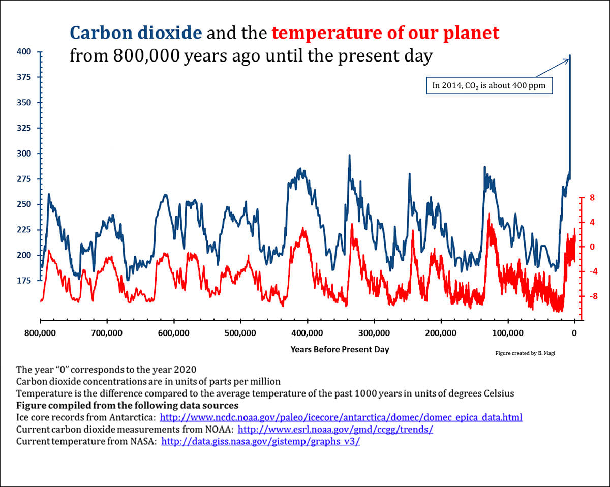 The graph shows in blue the CO2 concentration in the atmosphere, in parts per million, and the contemporary climate position, represented by polar temperature in degrees Celsius and depicted in red, for the past 8 lakh years.