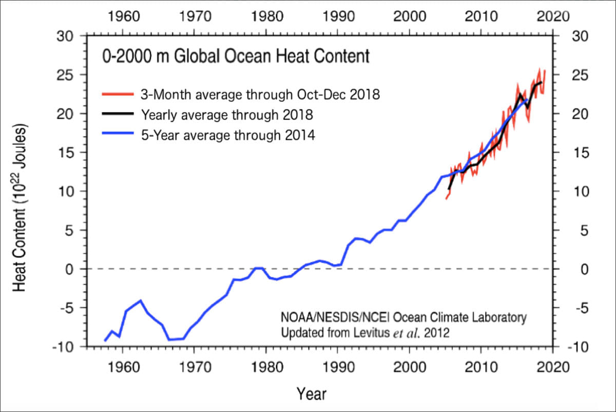 The fact is further established if we look at the change in ocean heat content over recent years. The graph below shows that there has been a relentless increase in the amount of heat stored in the ocean since the late 1960s, which has been accompanied by an increase in ocean temperatures.