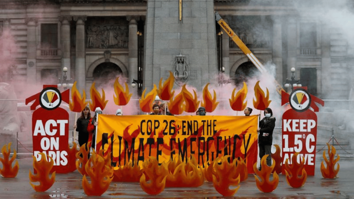 Activists symbolically set George Square on fire with an art installation of faux flames and smoke ahead of the UN Climate Change Conference (COP26), in Glasgow, Scotland, Britain on 28 October 2021 | Reuters File