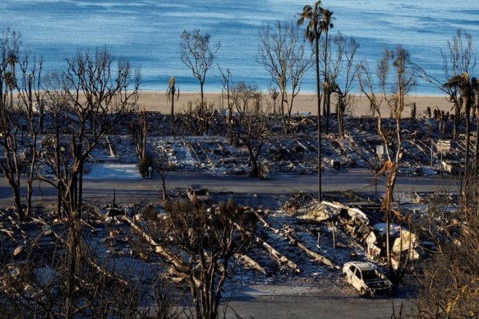 LOS ANGELES (Reuters) – A fluffy gray cat peered out of the window of a home that was spared the wrath of the Palisades Fire this month. Just next door, a house had burned to the ground.