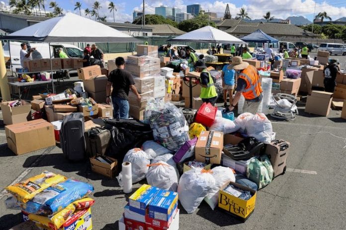 LAHAINA, Hawaii (Reuters) – Although Uilani Kapu’s home was spared by the wildfires that raged through West Maui last week, she has slept the last few muggy nights in a tent in a strip-mall parking lot as she helps oversee the distribution of donated food, clothing, baby formula and other essentials to neighbors who have lost everything.