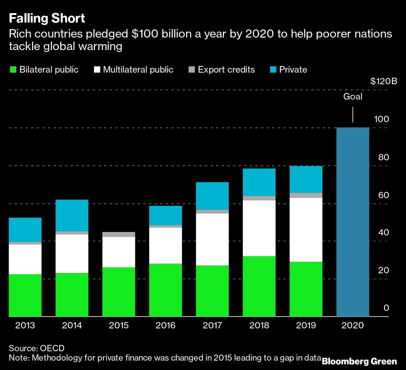 Total climate finance provided and mobilized by rich countries for developing nations was $79.6 billion in 2019, an increase of just 2% from 2018, the Organisation for Economic Co-operation & Development said. It would require a more than $20 billion annual jump to meet the funding goal for 2020 alone. The rate of annual increases has only slowed over the past few years.