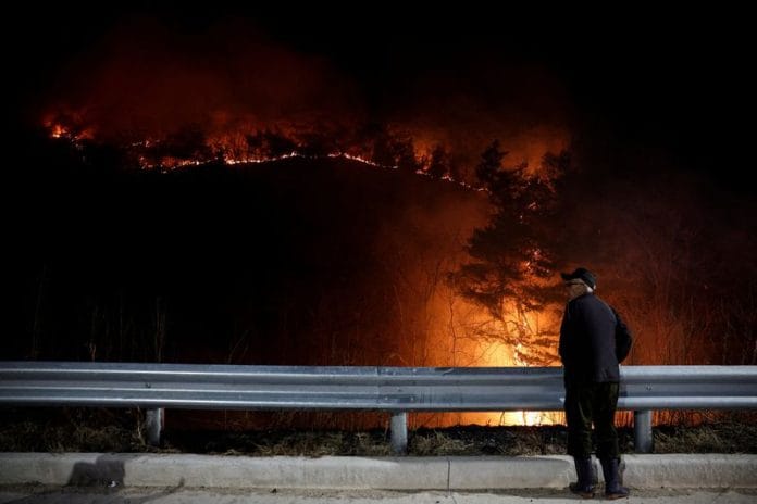 SEOUL (Reuters) – South Korean police said on Sunday they booked a man suspected of starting what grew into the country’s largest wildfire, killing at least 26 people and razing thousands of buildings including historic temples.
