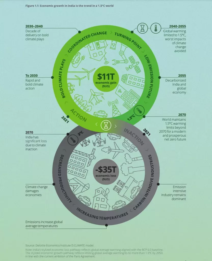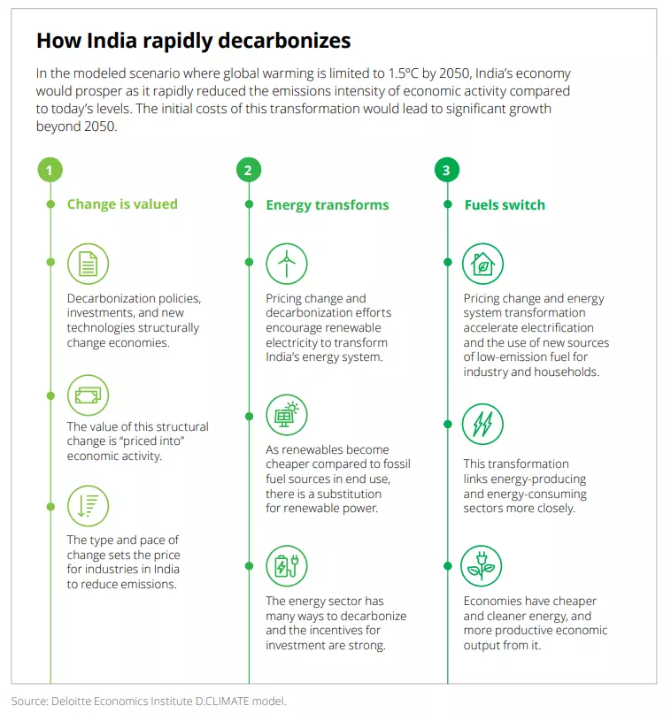 The good news is that India is well positioned to help the world transition to a green economy, and could achieve “significant economic growth” by supplying the products, services and financing the world will need to limit temperature increases, Deloitte says.