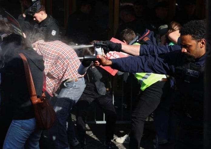 Outside the venue in central Paris, the smell of teargas from earlier clashes hung in the air and police used pepper spray as they dragged some protesters away to free a path for shareholders through several hundred climate activists.