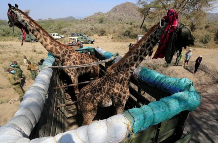 NAIVASHA, Kenya (Reuters) – Thirteen Masai giraffes in the Moi Ndabi area in Kenya’s Naivasha basin were darted and loaded onto trucks following a rescue effort, after long being threatened by poachers and conflict with local communities.