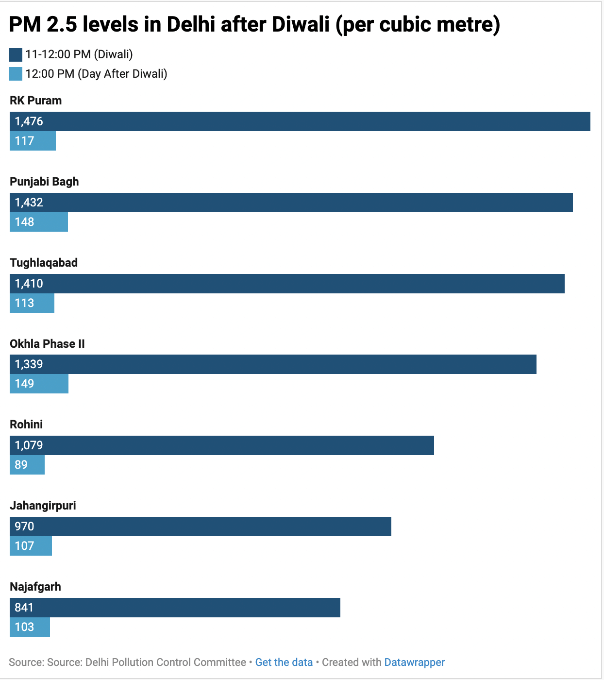 The level of PM2.5 dropped on Tuesday, but that doesn’t mean air pollution was particularly low this Diwali—the first in years when ‘green’ firecrackers were allowed in Delhi.