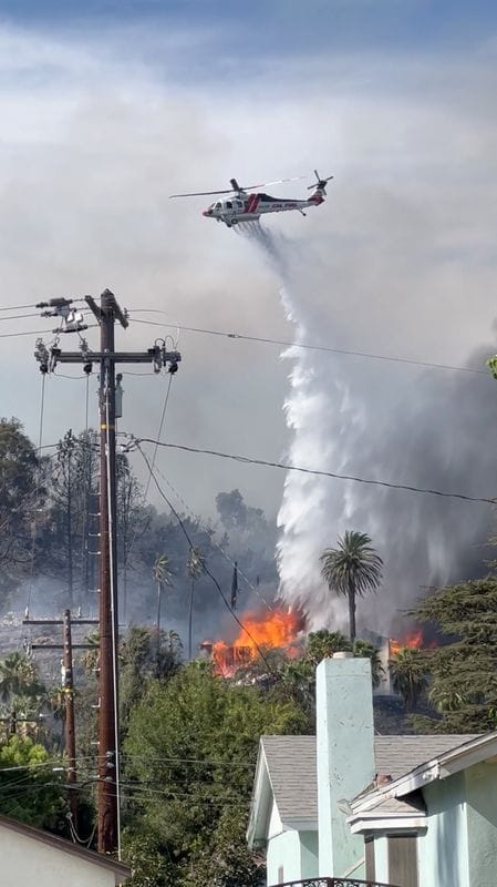 Video from local TV station KTLA 5 showed at least five residences had burned after the fast-moving brush fire jumped into up-market homes overlooking the city of 220,000 located around 55 miles (88 km) east of Los Angeles.