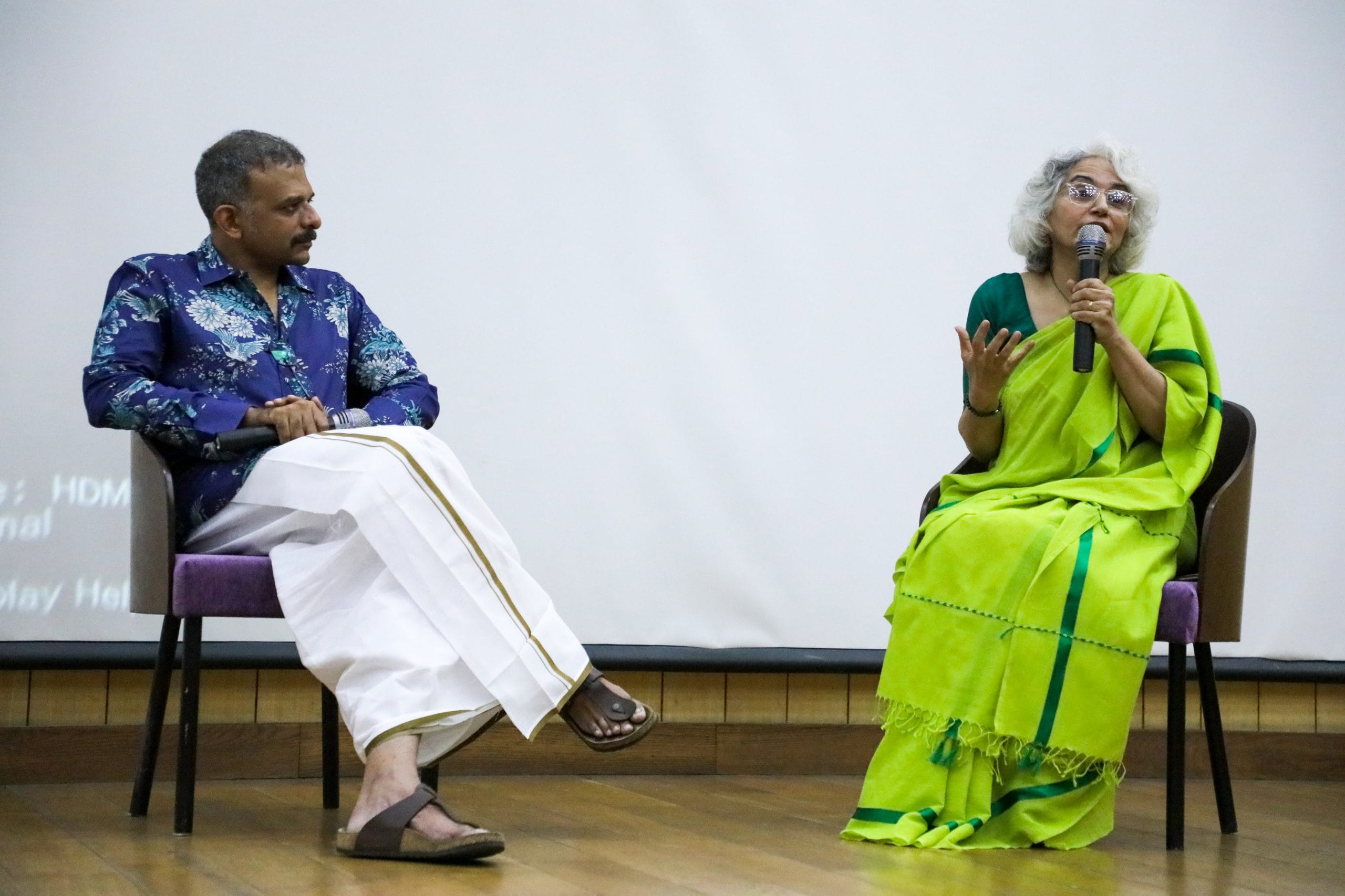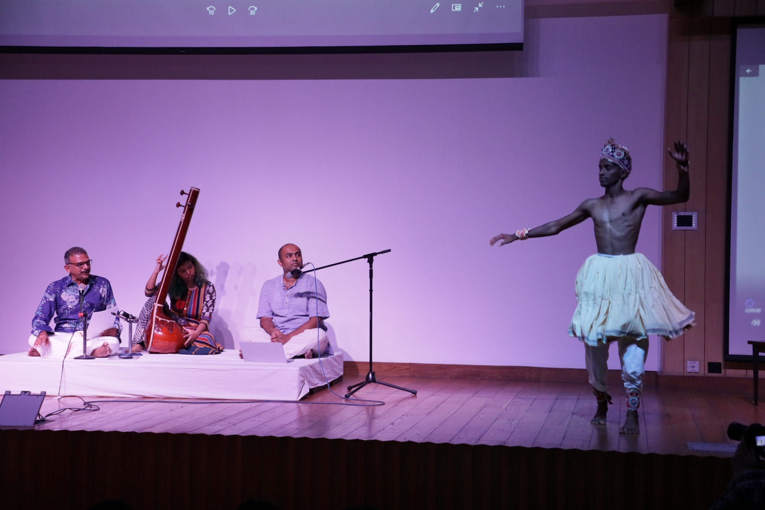 All eyes were on T.M. Krishna when he took to the stage wearing a mundu. A student from Ashoka accompanied him with a tanpura in hand. Naresh Kirti, professor of Sanskrit studies in Ashoka, joined the pair as he explained the meaning of the verses. The stage was set, lights were dimmed and as the student strummed the sitar, Krishna broke into song.