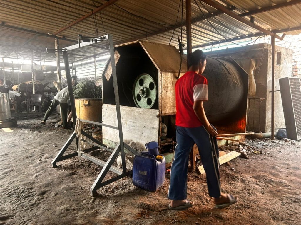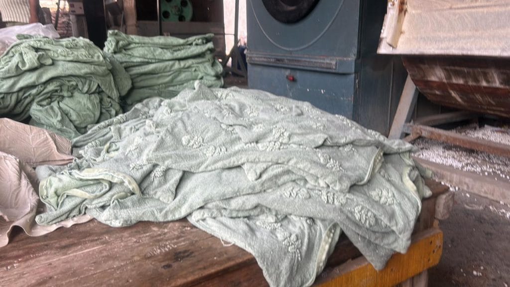The colours running through the machine on Wednesday were brown, grey, and green. The blue dye had been used three days earlier, workers said, though residues were still visible in parts of the unit.