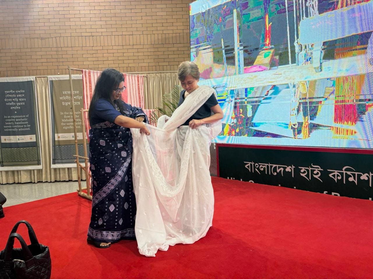 Featuring over 300 curated sarees, the display includes heritage pieces as well as contemporary interpretations. Curated by Chandra Shekhar Shaha, the president of the Bangladesh Crafts Council and Indian textile artisan Chandra Shekhar Veda, the exhibition reflected a shared cross-border effort to preserve and celebrate South Asia’s textile heritage. The exhibition was inaugurated by Bangladesh High Commissioner M Hamidullah Riaz, designer Laila Tyabji and interior designer Sunita Kohli.
