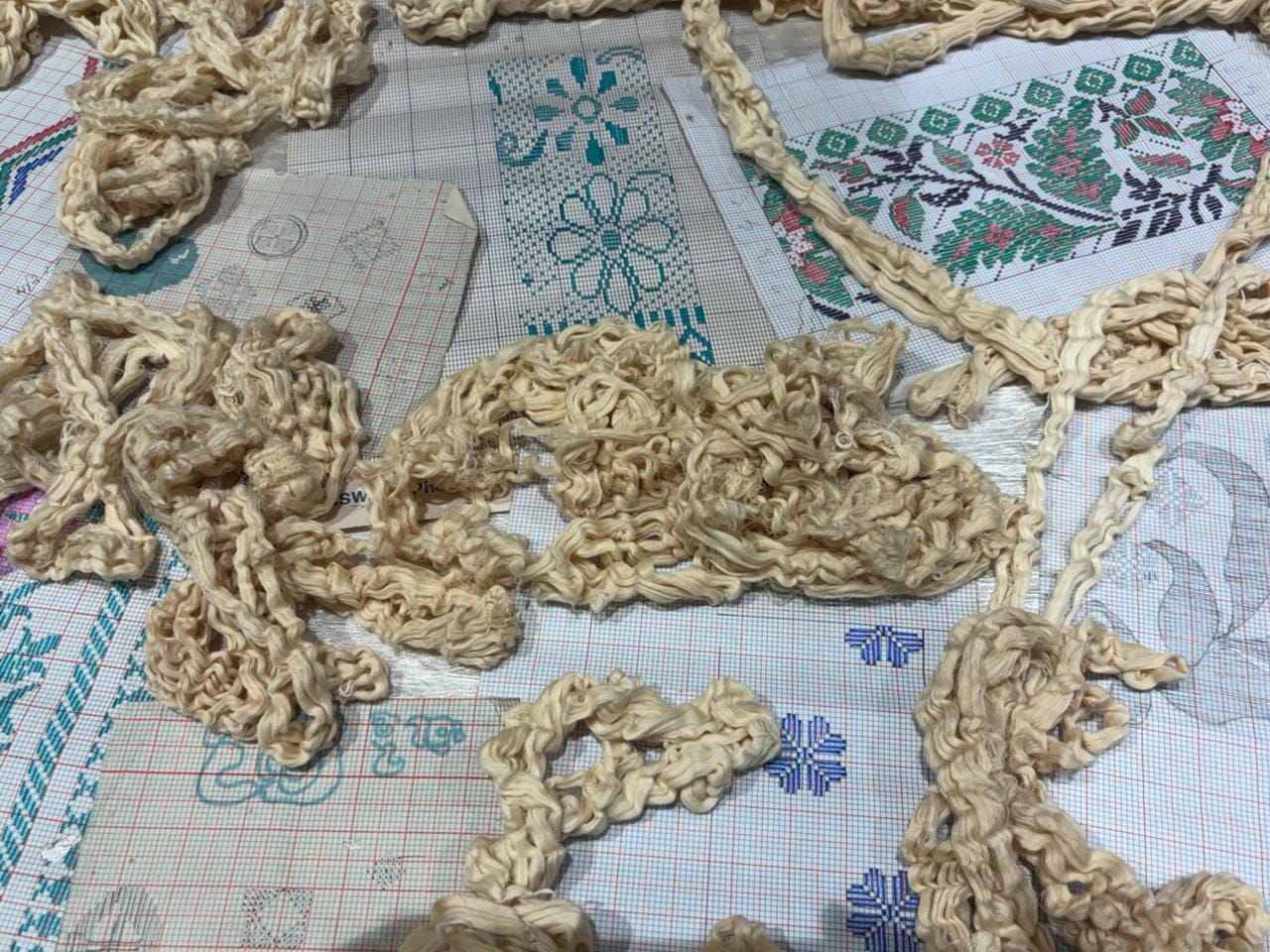 The hall resembled less a diplomatic venue and more a living archive of craft and continuity. The room itself is curated as a narrative: shuttles designed as boats floating in the nearby pond, and design palettes, heirloom textiles, and scraps of fabric are scattered intentionally to tell a larger story. Some of the pieces were almost 60 to 70 years old, preserved by weaving families like Basak’s.
