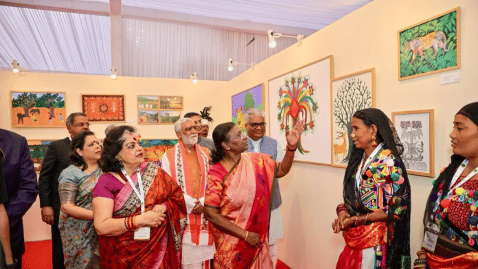 New Delhi: Bono Devi is the powerful goddess of Sundarbans in West Bengal, never seen without her mighty consort — the Bengal tiger. Having grown up with the stories of the goddess in her village adjacent to the Sunderban Tiger Reserve, 32-year-old Madusree decided to portray her through her paintings at an exhibition at Delhi’s India Habitat Centre. Called ‘Silent Conversation: From Margins to the Centre’, the three-day exhibition marks the completion of 50 years of Project Tiger and was inaugurated by President Droupadi Murmu Friday.