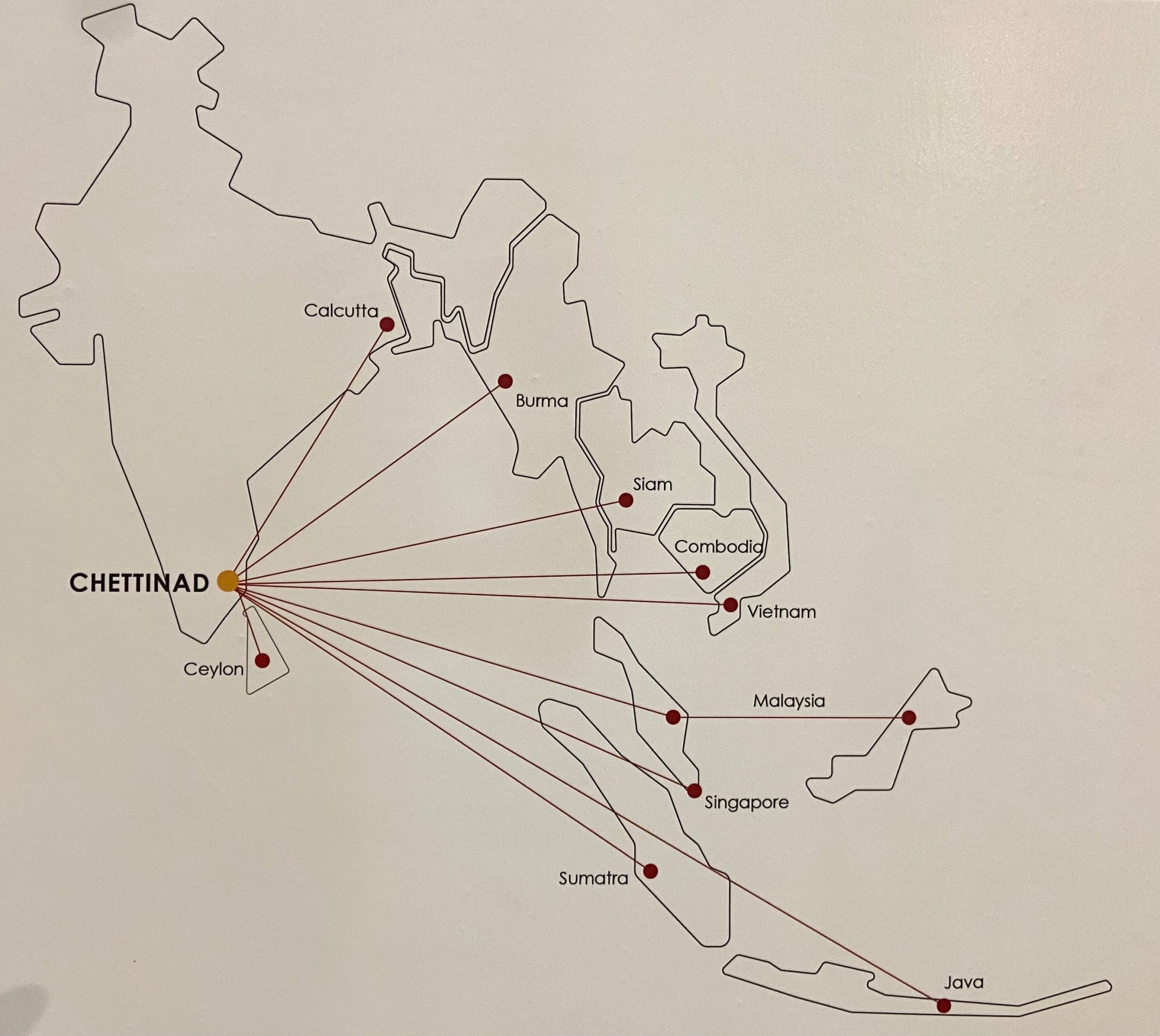 At the centre of the exhibition space lies the main information board, with a map of South and Southeast Asia. Marked on it are Vietnam, Cambodia, Malaysia, and Singapore—Chettiar people and culture are found in all these places. The concept note for the exhibition explains that it was in the context of imperialism that Chettiars relocated to British colonies bordering the Indian Ocean to establish financing firms.