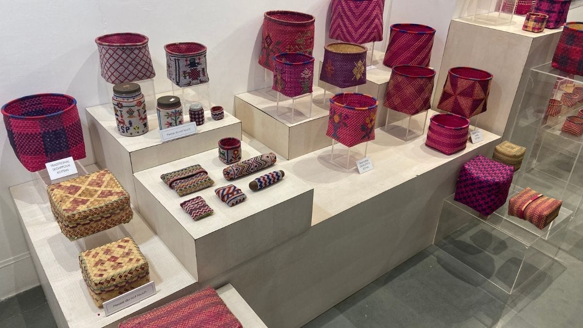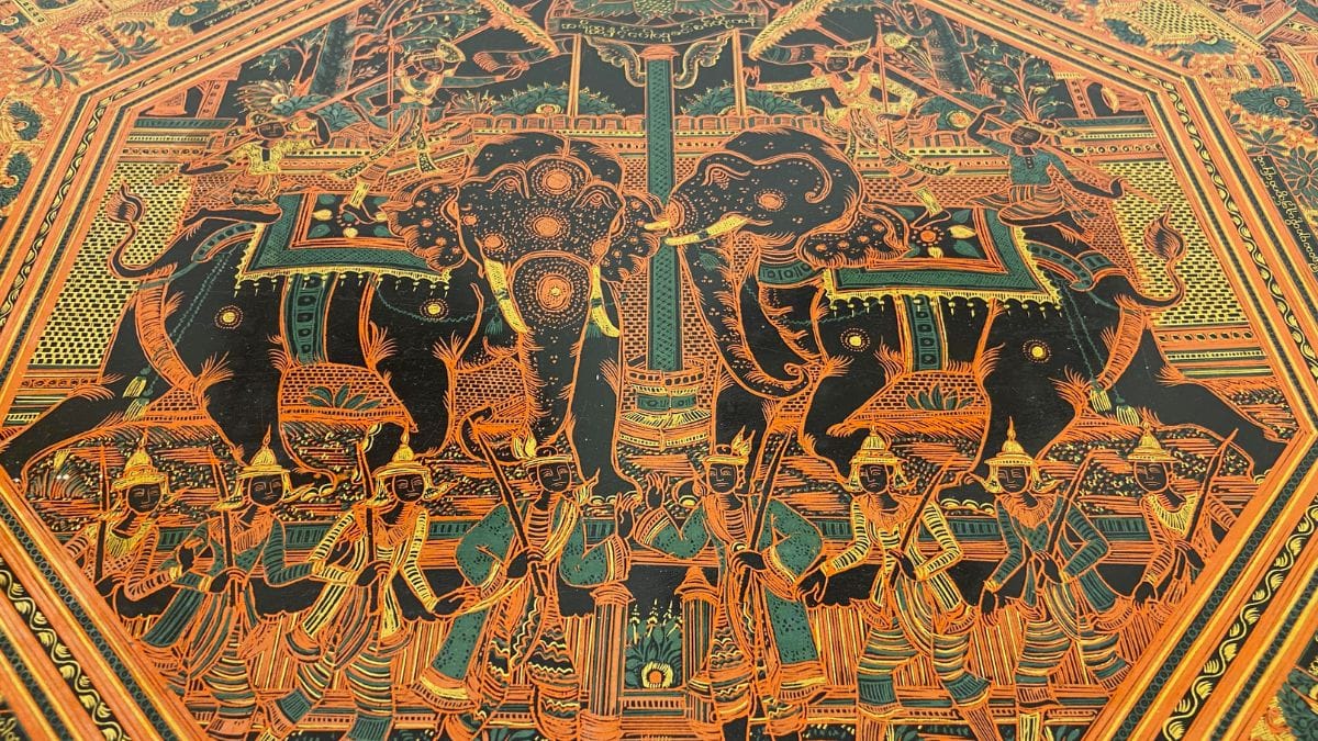 And so, Ramaswamy’s exhibition recounts how Chettiar mercantile communities in erstwhile Burma would periodically send lacquerware back to the Chettinad homeland. These painted objects are collectively known as maravai in Tamil and have generally been made of wood or woven rattan and horsehair. Visitors can see some beautiful examples at the exhibit.