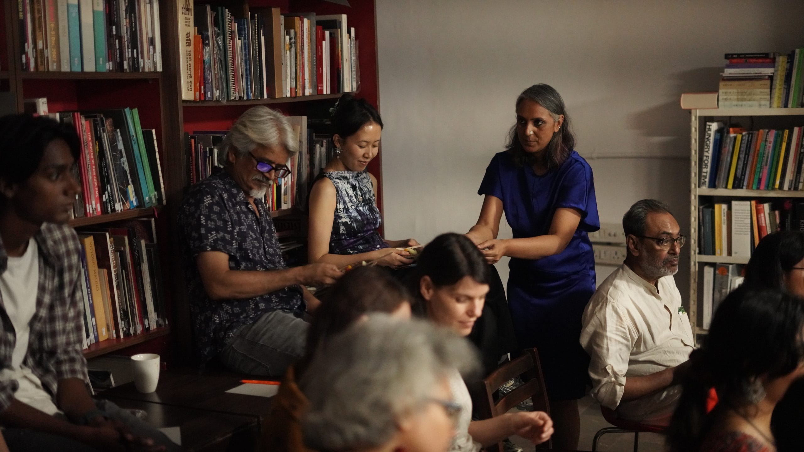 Small conversations fill the room as people gather — about research, new jobs, exhibitions — before gradually quietening. A brief introduction follows, tracing the origins of the artistic collaboration between Manmeet Devgun, a Delhi-based performance and inter-disciplanary artist and art educator, and Heike Fiedler, a German-origin writer, and visual and sound artist. the first collaborated in 2015 with the performance of ‘T-able: Sound and Dialogues’ in Geneva, Switzerland.