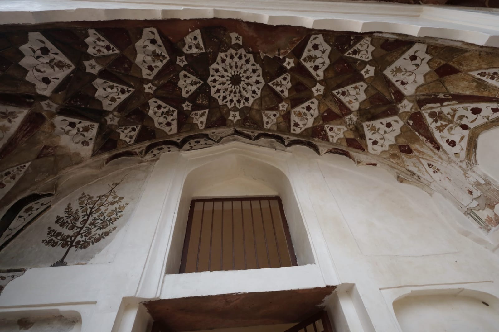 The architecture is made of bricks and lime plaster. Its walls are adorned with paintings of flowers and plants. The main building has a pavilion with a water channel running through it, a hallmark of Mughal aesthetics. A red sandstone building adjacent to Sheesh Mahal is believed to have functioned as a hamam.