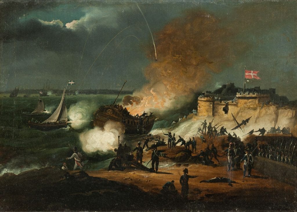 The Dannebroge, a 48-metre flagship commanded by Commodore Olfert Fischer, was singled out as a primary target. Cannon fire tore through its upper decks before incendiary shells ignited a fire onboard.