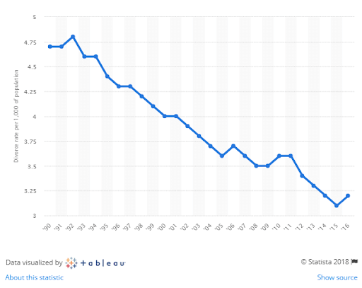 As the chart shows, the US divorce rate began falling in the early 1990s and has since continued on an overall downward trend. In 1992, there were 4.8 divorces per 1,000 population. By 2016, this had dropped to 3.2.