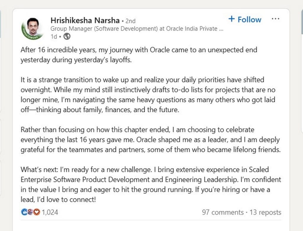 Since the layoffs, some axed Oracle employees have recounted their experiences on LinkedIn. Hrishikesha Narsha, who spent 16 years at Oracle and rose to Group Manager (Software Development), described how he was still reeling from the shock.