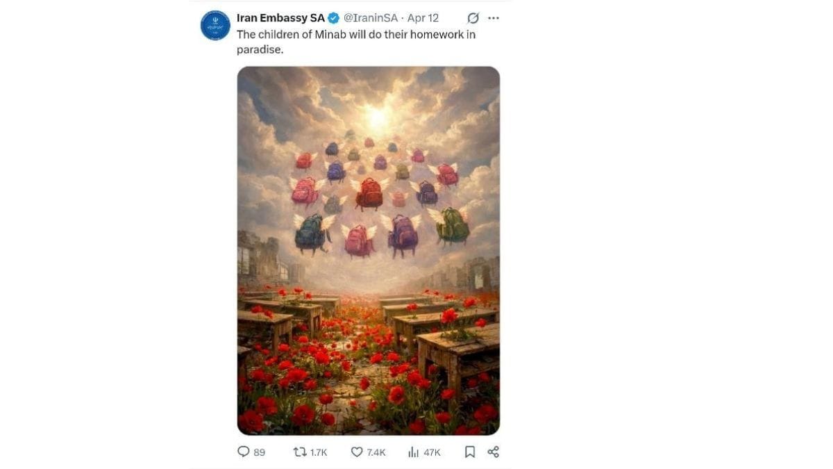 The current government has also humanised the idea of martyrdom to include civilians who have been killed in the conflict. Through their social media posts, Iranian embassies have also highlighted the bombing of a school in Minab, which resulted in over 170 deaths, including over 100 children. By evoking the innocence of those killed, these colourful AI-aided digital artworks make an implicit judgement on the enemy’s inhumanity.