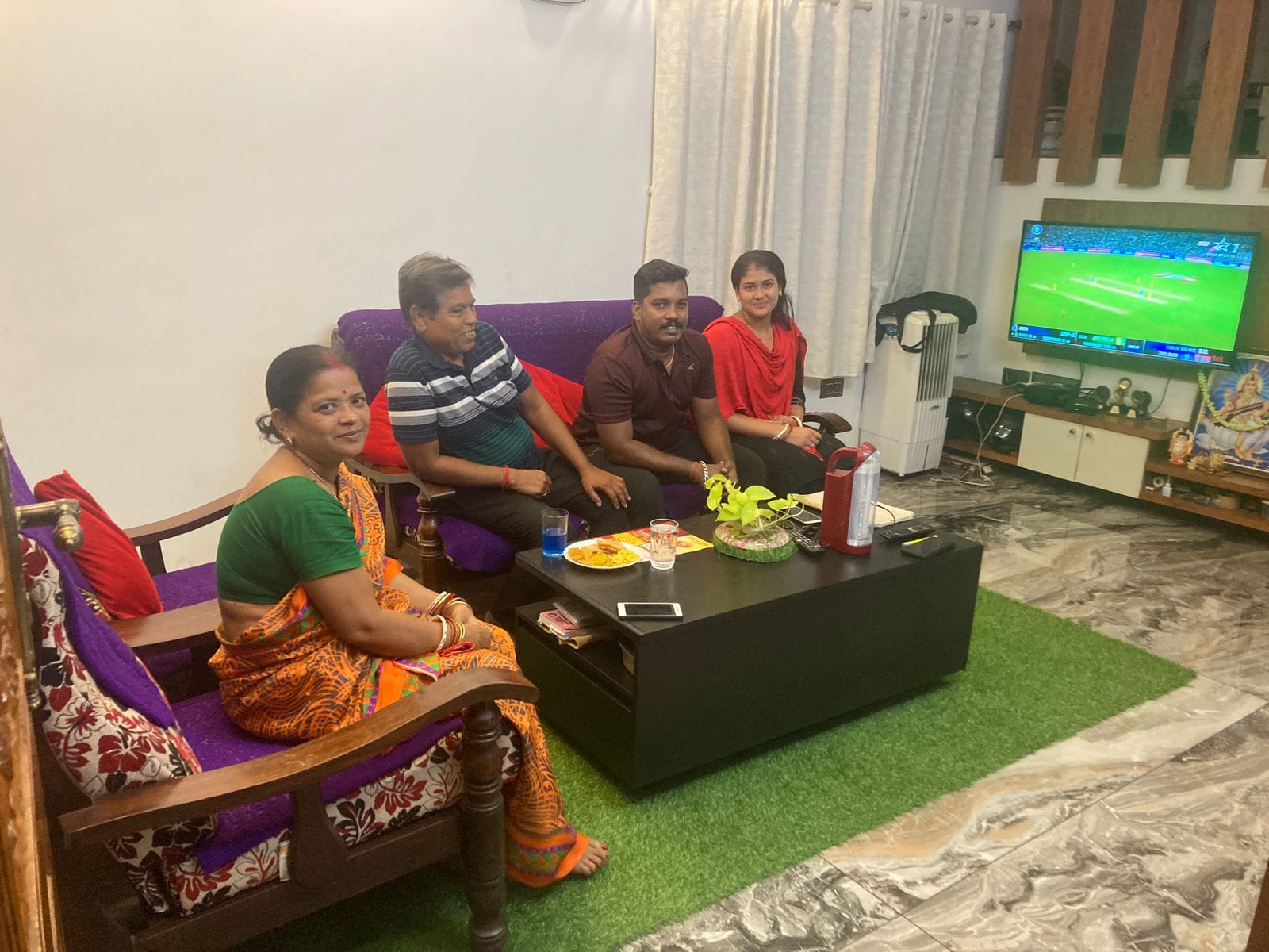 She sits back on her purple sofa, and the family continues watching a cricket match on their 55” flat screen TV.