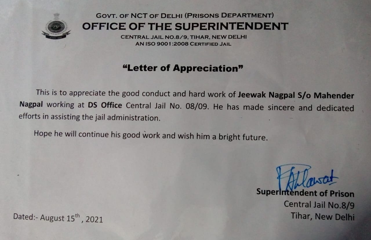 The certificate appreciating Jeevak’s ‘good conduct and hard work’ in jail | Special arrangement | ThePrint