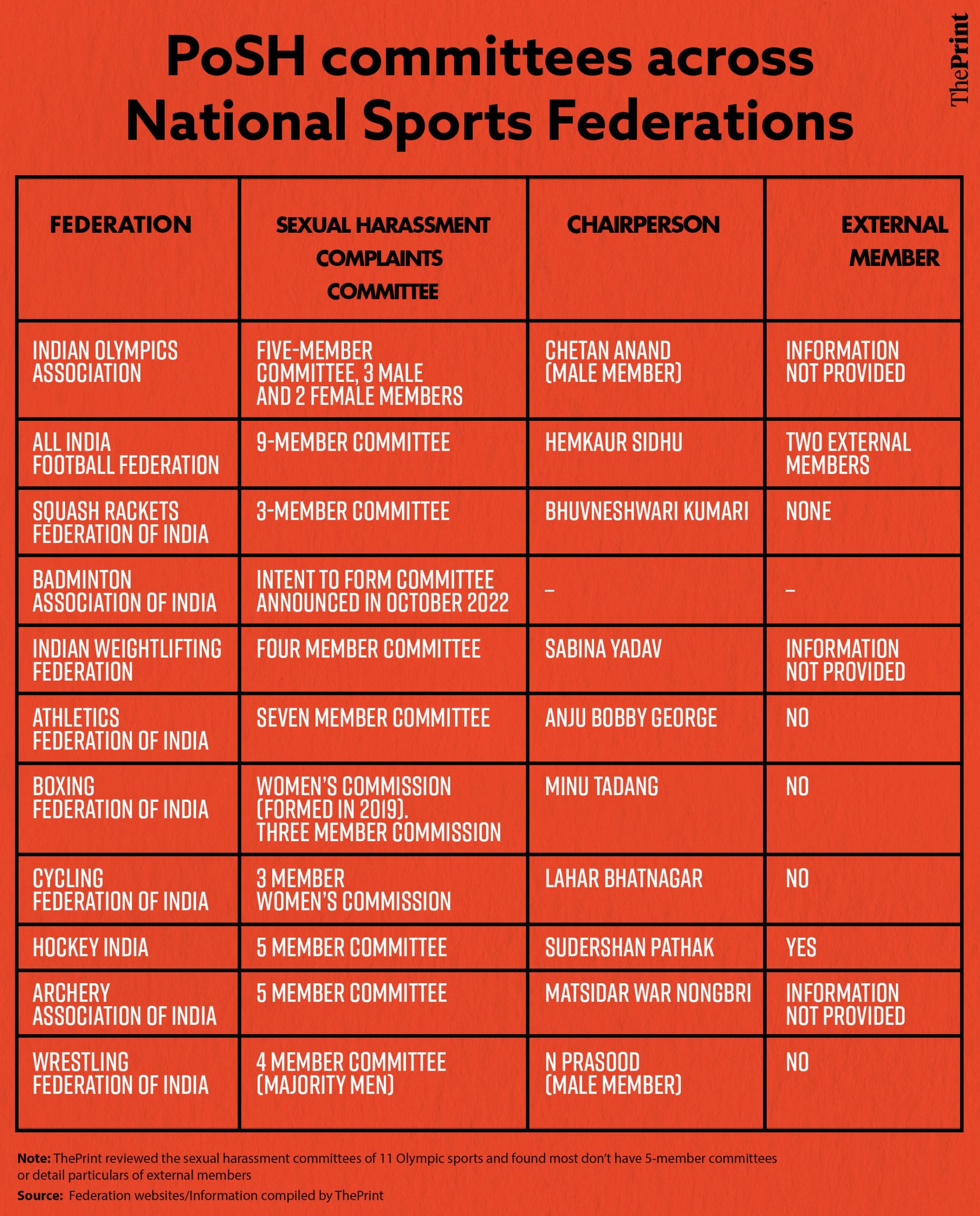 ThePrint reviewed the sexual harassment committees of 11 Olympic sports and found most don’t have 5-member committees or detail particulars of external members.