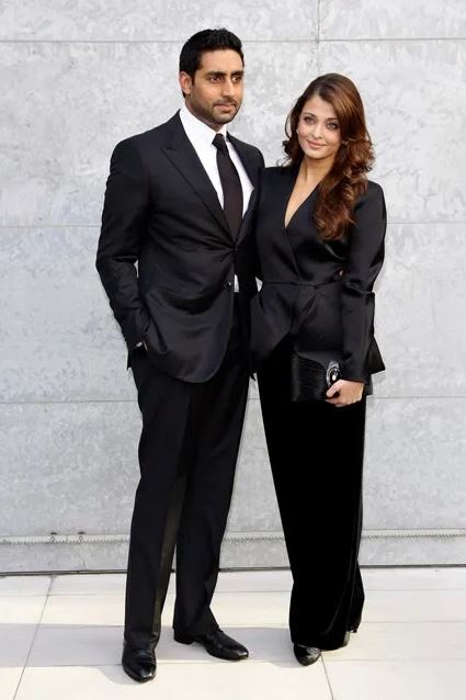 While Aishwarya wore wide-legged velvet Armani trousers paired with a smart black satin jacket and a simple clutch, Abhishek chose a black suit with a white shirt.