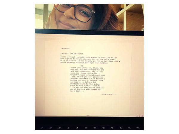 “INTERVAL – INT/EXT DAY UNIVERSE… After a brief hiatus, the woman in question holds her laptop to write another script one more time. With gratitude in her heart, prayer on her lips, and a smile beaming through her eyes, she mumbles – ME: Thank you, universe. Thank you, God, for all the challenges and all the blessings. Had it not been for these obstacles, I wouldn’t have acknowledged your love. Thank you for giving me another opportunity to become a better version of myself. And so, here’s to Tahira 3.0! Back to the grind, back to the hustle, back to life, and so glad to be back at work! Picture abhi baaki hai mere dost :)” the document read.