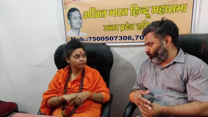Pandey is married to Pooja Shakun Pandey, better known as Sadhvi Annapurna, national president of Akhil Bharat Hindu Mahasabha, a political party in Aligarh and the force behind this meeting. While Annapurna relinquished all past familial relationships when she donned the saffron robe in 2017, Ashok has been her constant shadow.