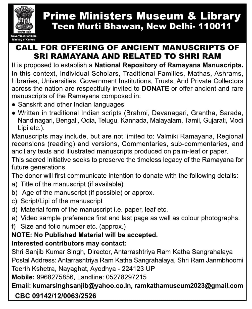 According to the advertisement, manuscripts may include but are not limited to Valmiki’s Ramayan, regional editions and versions, along with commentaries, sub-commentaries, ancillary texts, and illustrated manuscripts produced on palm-leaf or paper. The manuscripts should be composed in Sanskrit and other traditional Indian languages such as Brahmi, Devanagari, Grantha, Sarada, Bengali, and Telugu.