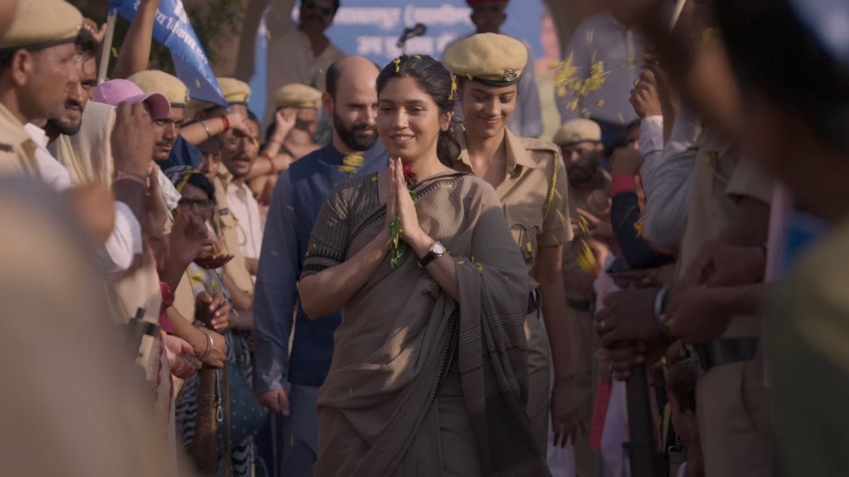 The film opens with a young, power-hungry politician Vicky Singh (Sumeet Vyas) delivering a stump speech in Rajasthan’s Sawalpur as his cavalcade makes its way through a Muslim-majority neighbourhood. Violence soon breaks out, and Vicky’s trusted aide Chandan (Sharib Hashmi) kills a Muslim butcher in his shop. The video goes viral, eliciting anger from Vicky’s fiance Nivi (Bhumi Pednekar)