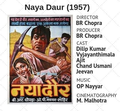 This sets the precedent for the rest of the film, which captured the Indian audience at the time like no other film because they were seeing the advent of industrialisation in real time as well. Naya Daur tells a simple story. Shankar, played by Dilip Kumar, is a tonga-puller. He is the resident of a village where everyone has a job and people live in harmony. It’s an idealistic society, where the people get proper wages for the work they do — an idea enforced by the owner of the local woodworking factory. Conflict arises when the factory owner’s son returns to the village and brings mechanisation in a bid to develop the village and make the business more profitable. Even as many villagers are put out of jobs, the son goes a step further and introduces a bus service, which threatens the tongawalas, including Shankar. In a fit of anger and after protest, Shankar challenges the owner to a race — his tonga versus the bus.