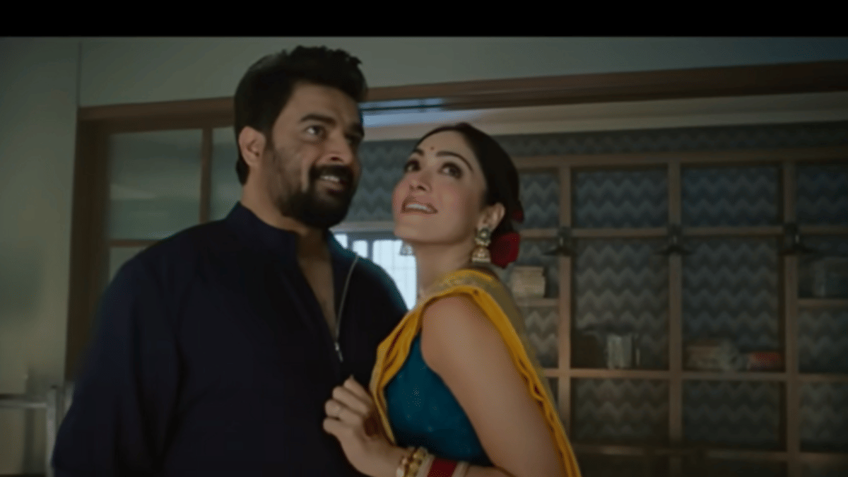 The film circles around a supposedly delusional woman Sanchi (played by debutant Khushalii Kumar) who has been held hostage by an alleged terrorist Haq Gul (Aparshakti Khurana) in a Mumbai apartment. Leading a team of Mumbai Police is ACP Harishchandra (Darshan Kumar) standing helplessly, listening to Gul’s ever-changing list of demands. Sanchi’s husband Yatharth (R Madhavan), waiting alongside the army of police, warns the personnel about his wife’s “volatile” personality, a byproduct of her mental illness.