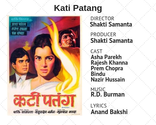 Kati Patang falls in the series of hits delivered by Khanna and features his signature dance step with the tilted head. Asha Parekh won the Filmfare award for Best Actress for her performance in the film.